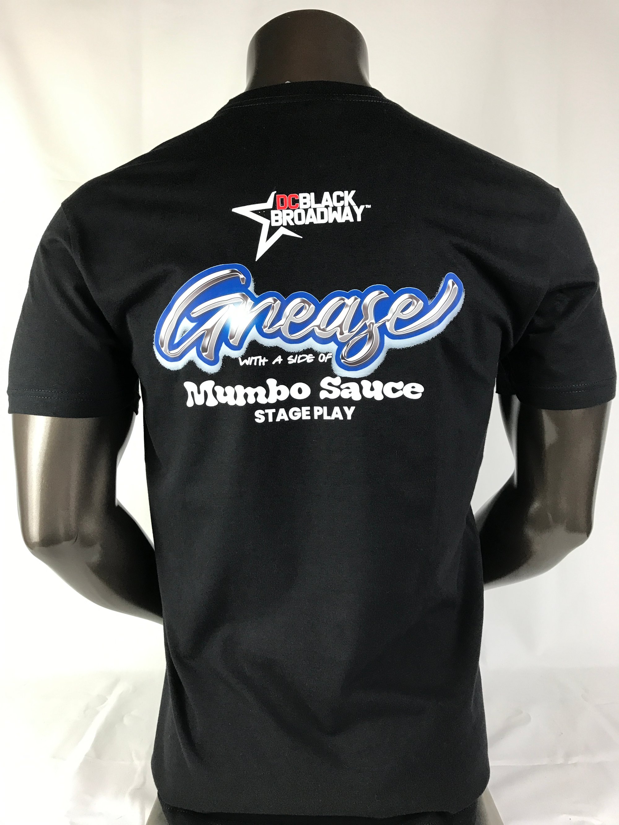print on premium black cotton t-shirt. LOVE DC GOGO X DC BLACK BROADWAY's GREASE with a side of Mumbo Sauce Collaboration T-shirt. Five different styles ..Front only print, blue Grease back, black grease back, Don Perignon Crew back, Hechinger Mall Honeys back.